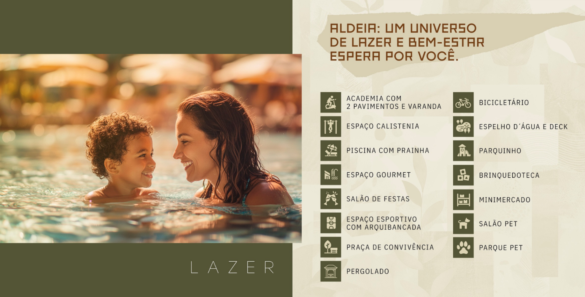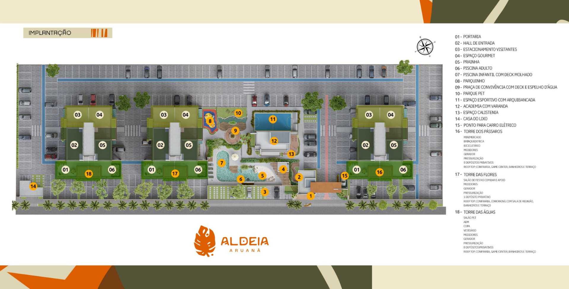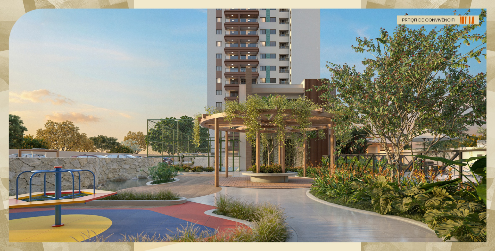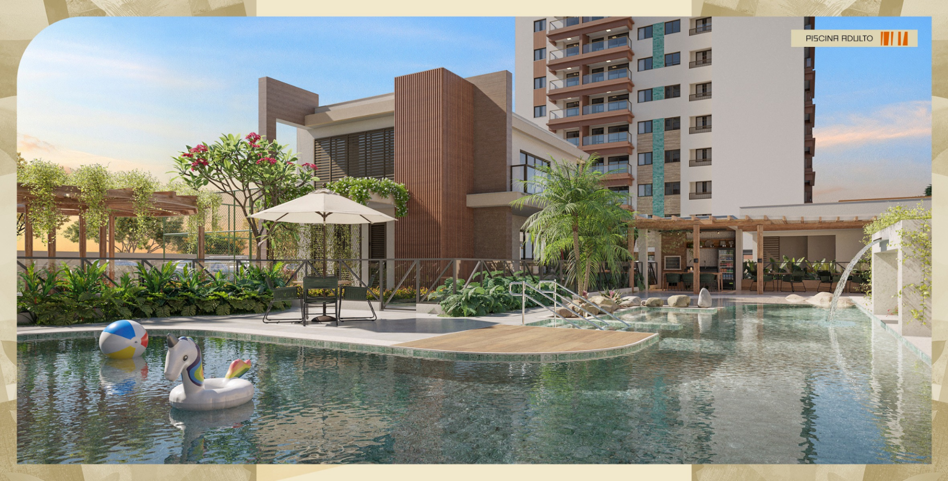 Lazer completo: academia com dois pavimentos e varanda, Espaço calistenia,Piscina com Prainha, Espaço gourmet, Salão de festas, Espaço esportivo com arquibancada, Praça de convivência, Pergolado, Bicicletário, Espelho d'água e deck, Parquinho, Minimercado, Salão pet e Parque pet.