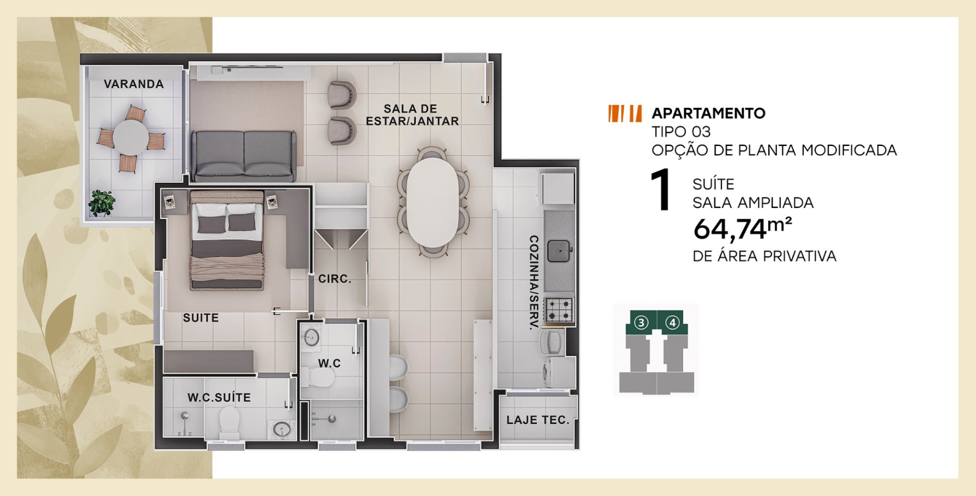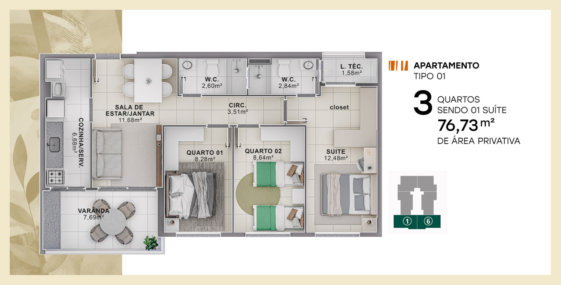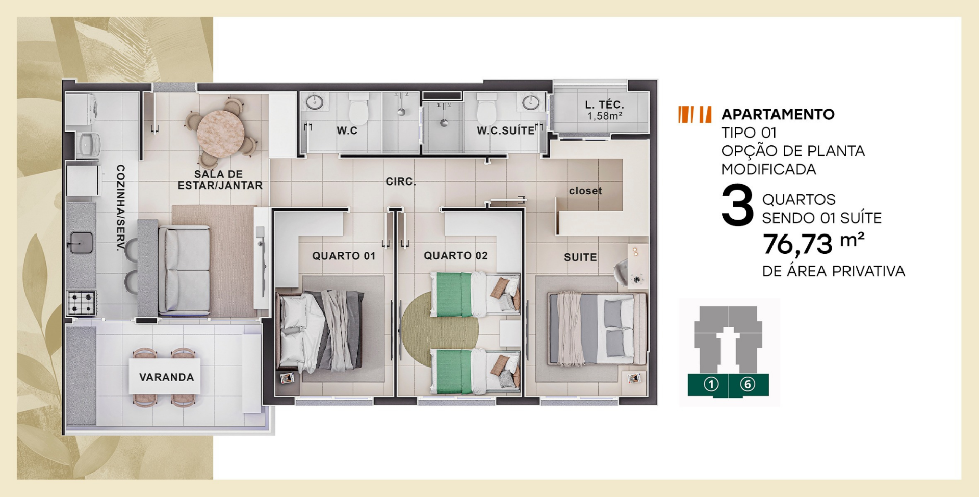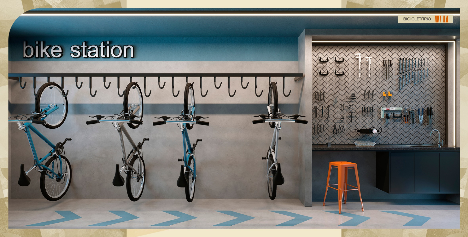 Lazer completo: academia com dois pavimentos e varanda, Espaço calistenia,Piscina com Prainha, Espaço gourmet, Salão de festas, Espaço esportivo com arquibancada, Praça de convivência, Pergolado, Bicicletário, Espelho d'água e deck, Parquinho, Minimercado, Salão pet e Parque pet.