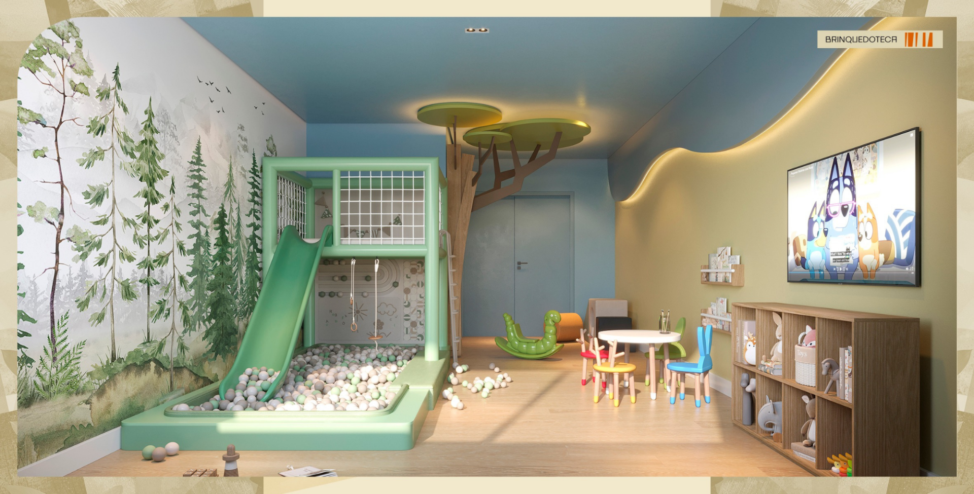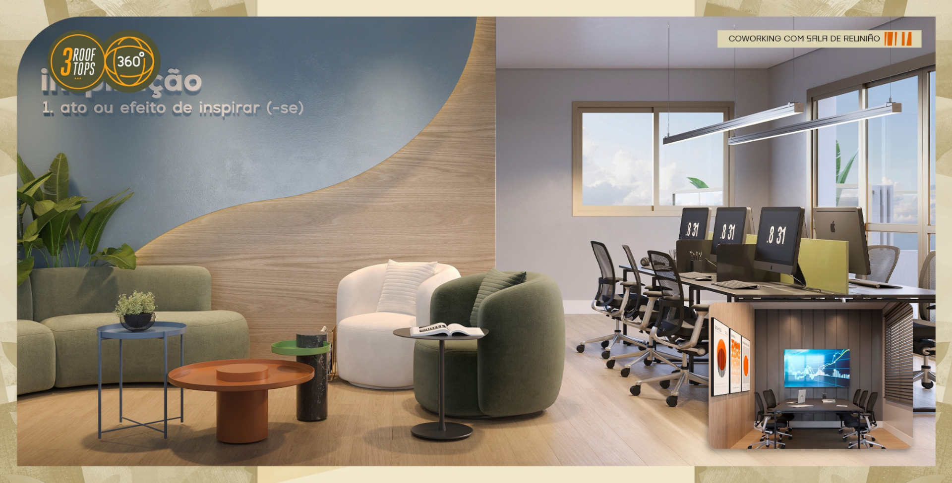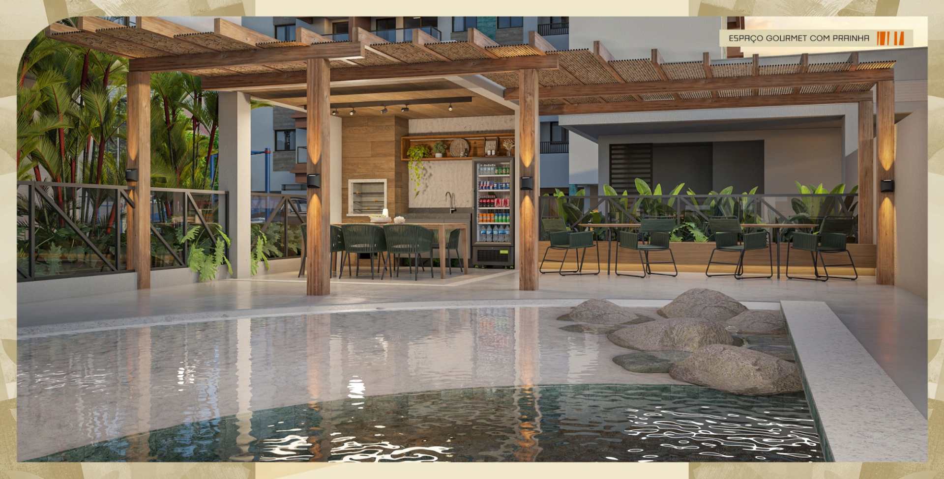 Terraço gourmet, três confrarias, dois games centers, coworking com sala de reunião, pergolado e áreas de convivência mobiliadas.