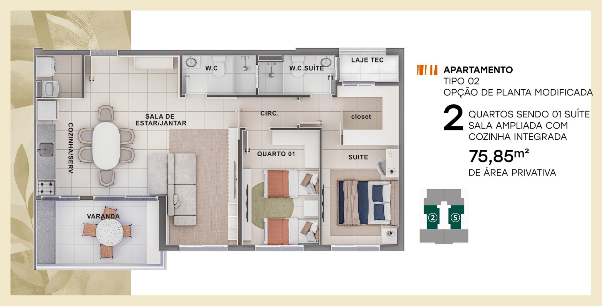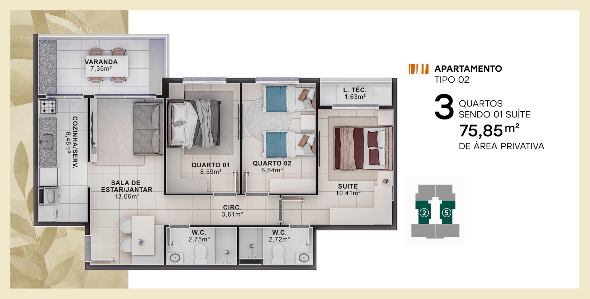 Apartamentos: 2 e 3 quartos sendo 1 suíte e varanda.