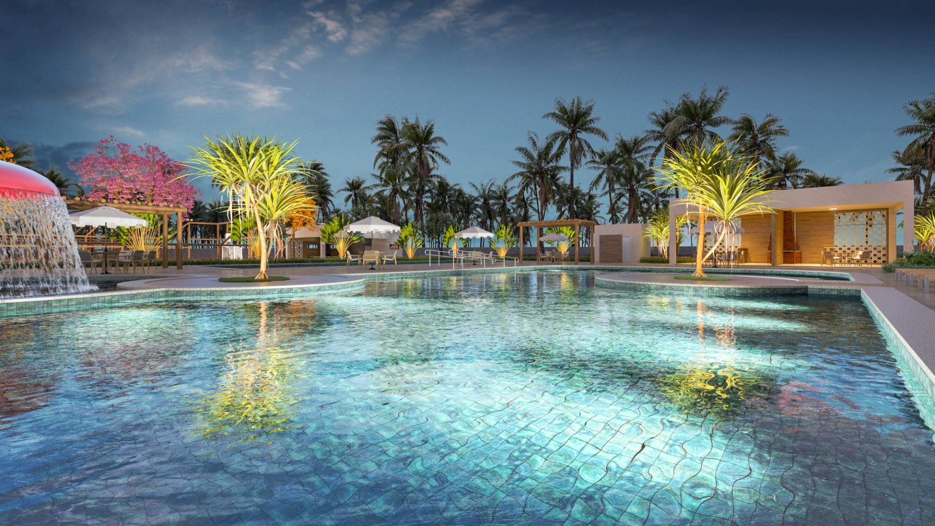 Quiosque com churrasqueira de apoio à piscina