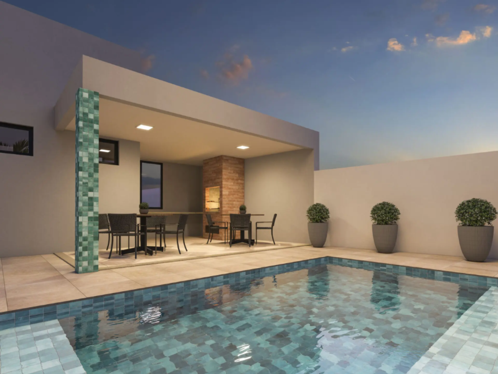 Pórtico de entrada com pele de vidro, duas áreas gourmet sendo uma com piscina privativa.